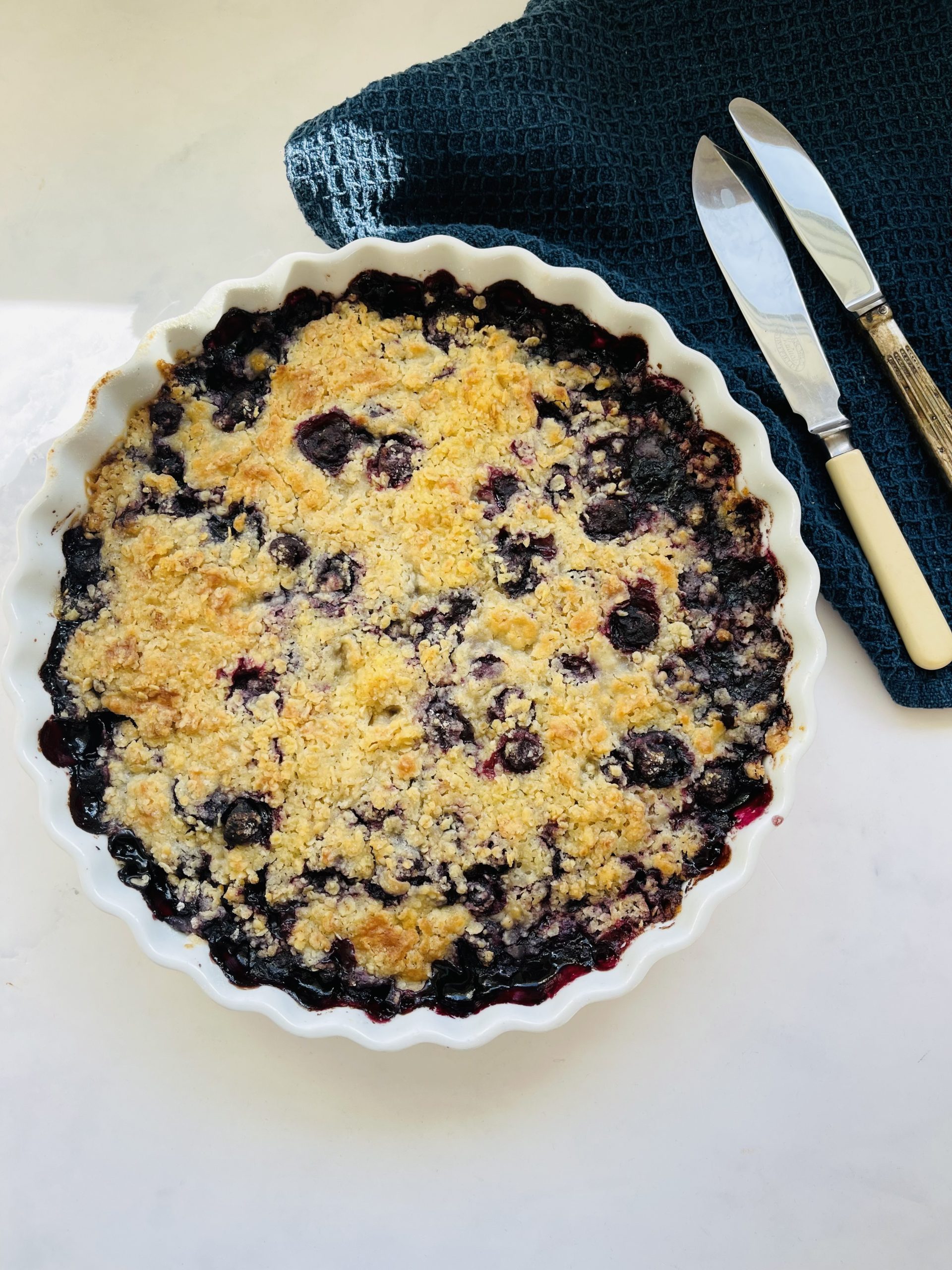 Vend sukker og mel og smuldr smørtern heri. Kom over bærrene og presenkelte steder dejen let ned i bunden. Bages i midten af ovnen i ca. 30 min. til boblende og gylden