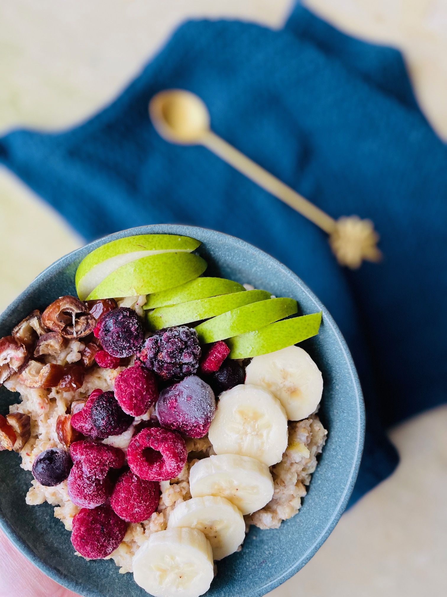 Den færdige grød kan toppes med alt fraFriske eller frosne bær,Æblemos eller friske æbleternPæremos eller friske pæretern,Grofthakket hassel eller valnødderTørret dadler, figner, tranebær eller rosinerKanelsukker og smørSirup