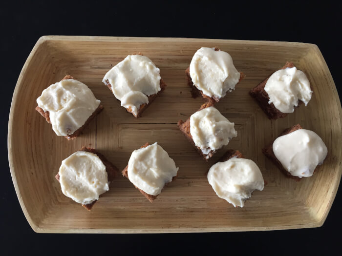 Den afkølede kagge kan smøres med frostingen, som er rørt sammen i en skål til der ikke er klumper i.