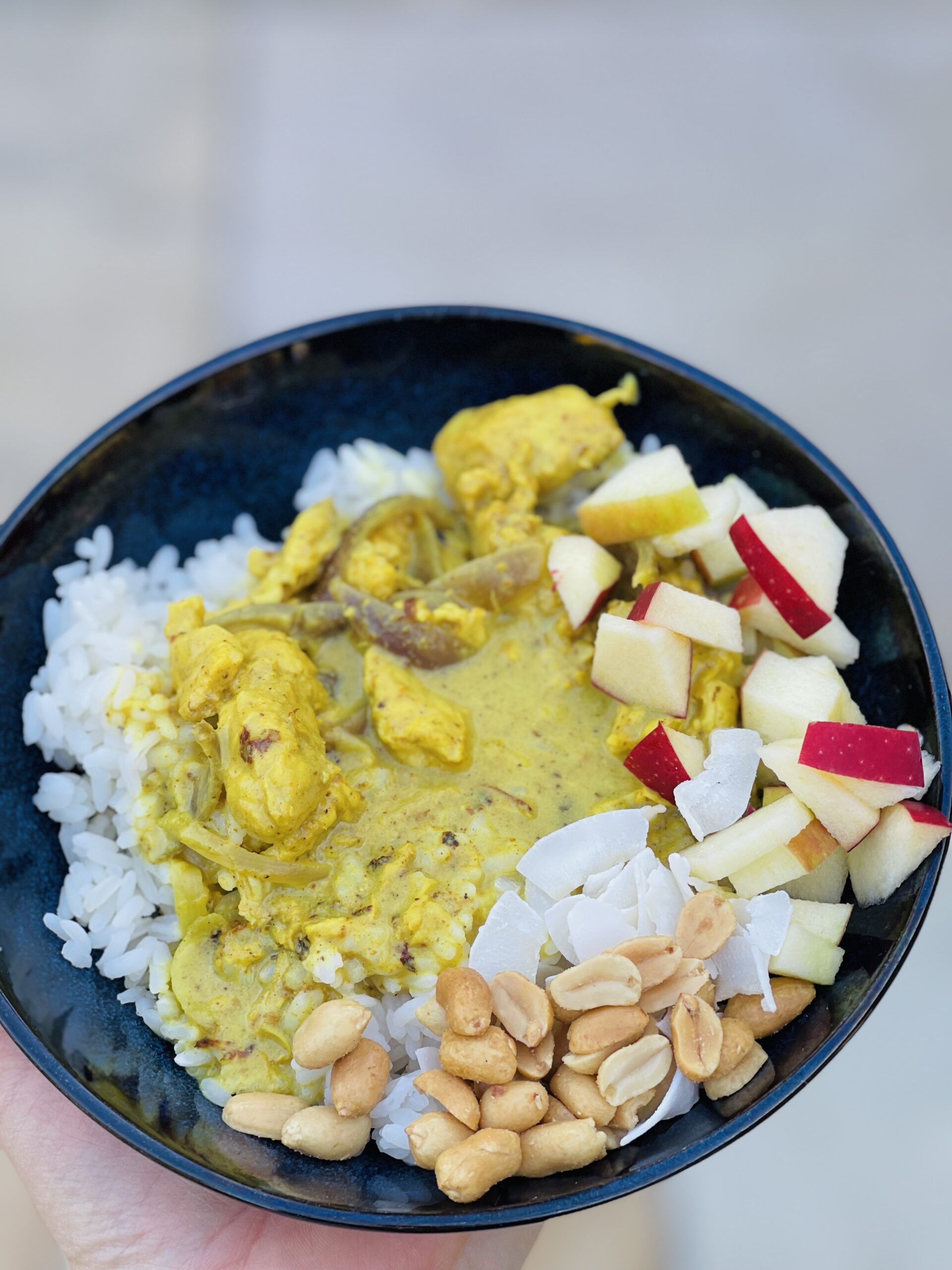 Nyd den færdige kylling i karry med ris og top med fx. æbletern, persille, peanuts eller lignende.