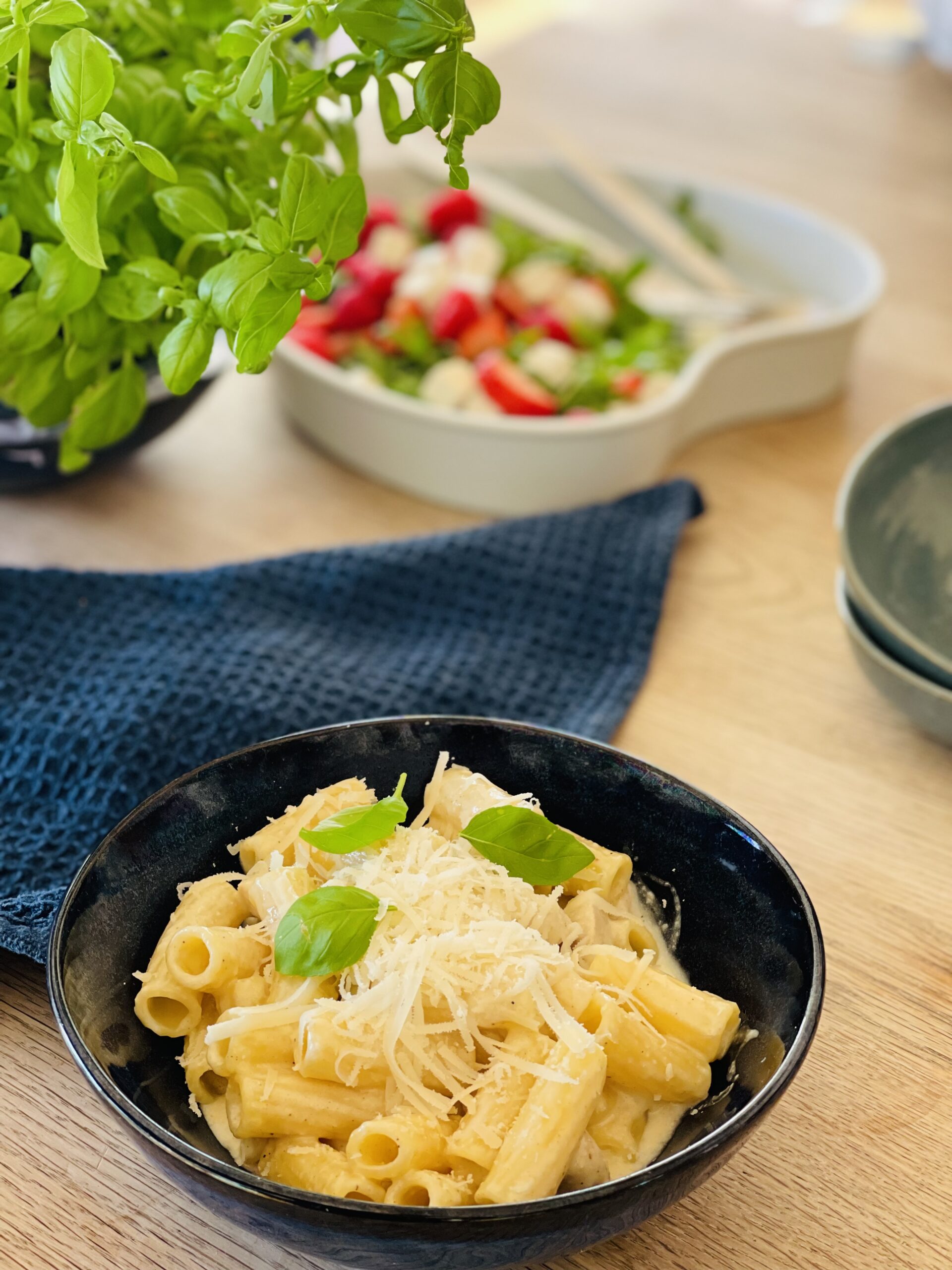 Kom pastaen i saucen og vend forsigtigt. Spæd til med kogevandet. Smag til og servér fx. med friske bailikumblade og ekstra parmesan.