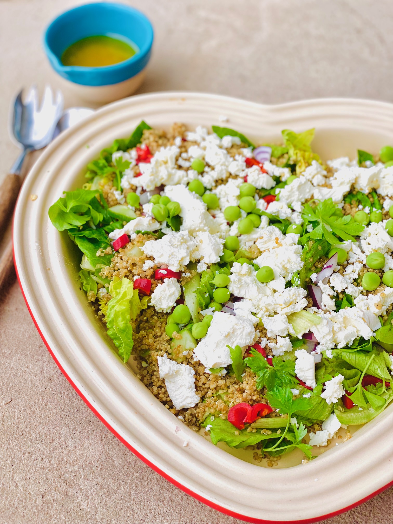 Frisk og lækker opskrift på en nem quinoa salat med fetaost, ærter og salat