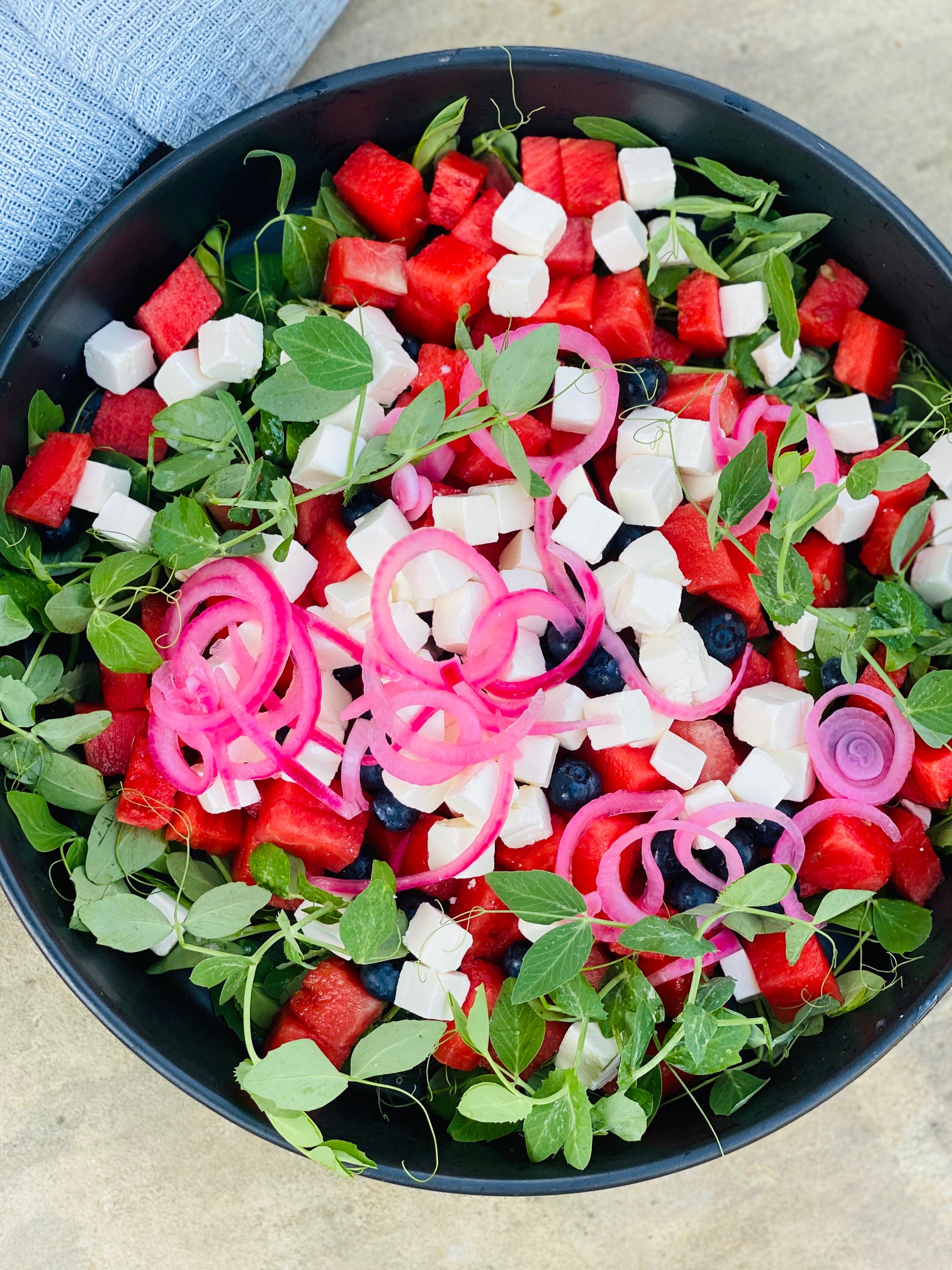 Her får du min opskrift på en fristende og sund sommersalat med ærteskud og vandmelon