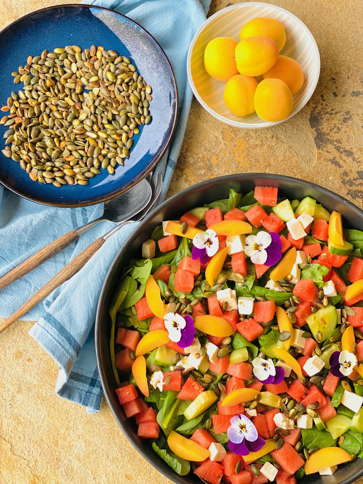 Dejlig frisk og nem salat med friske spinatblade, friske abrikoser, vandmelon og ristede græskarkerner